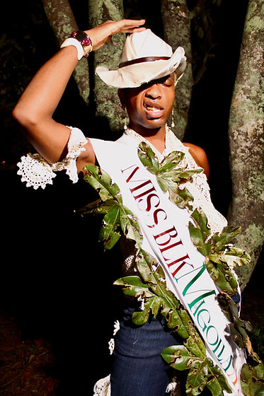 A true labor of love, this Head-to-toe custom look by Zaheim Kaon is a manifestation of my story. Growing up in Mississippi isn't easy when you look like me, but those scars are what make me unique. This is symbolized by the distressed and burned details in this look. A repurposed table cloth was used for the top, paired with a reconstructed pair of bespoke Wrangler jeans, a custom magnolia-inspired satin cowboy hat. The cherry atop it all was the custom sash trimmed in real magnolia leaves that i burned to continue the singed motif of the overall look.
